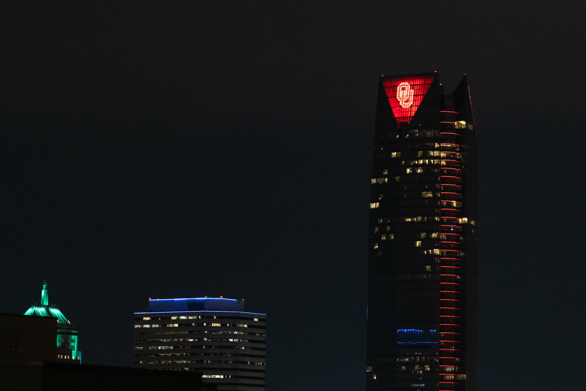 The Devon Tower in downtown Oklahoma City was flashing the neon interlocking OU atop the building on Friday night. It was like a signal calling on our intrepid hero Soonerguy to come and save the day.